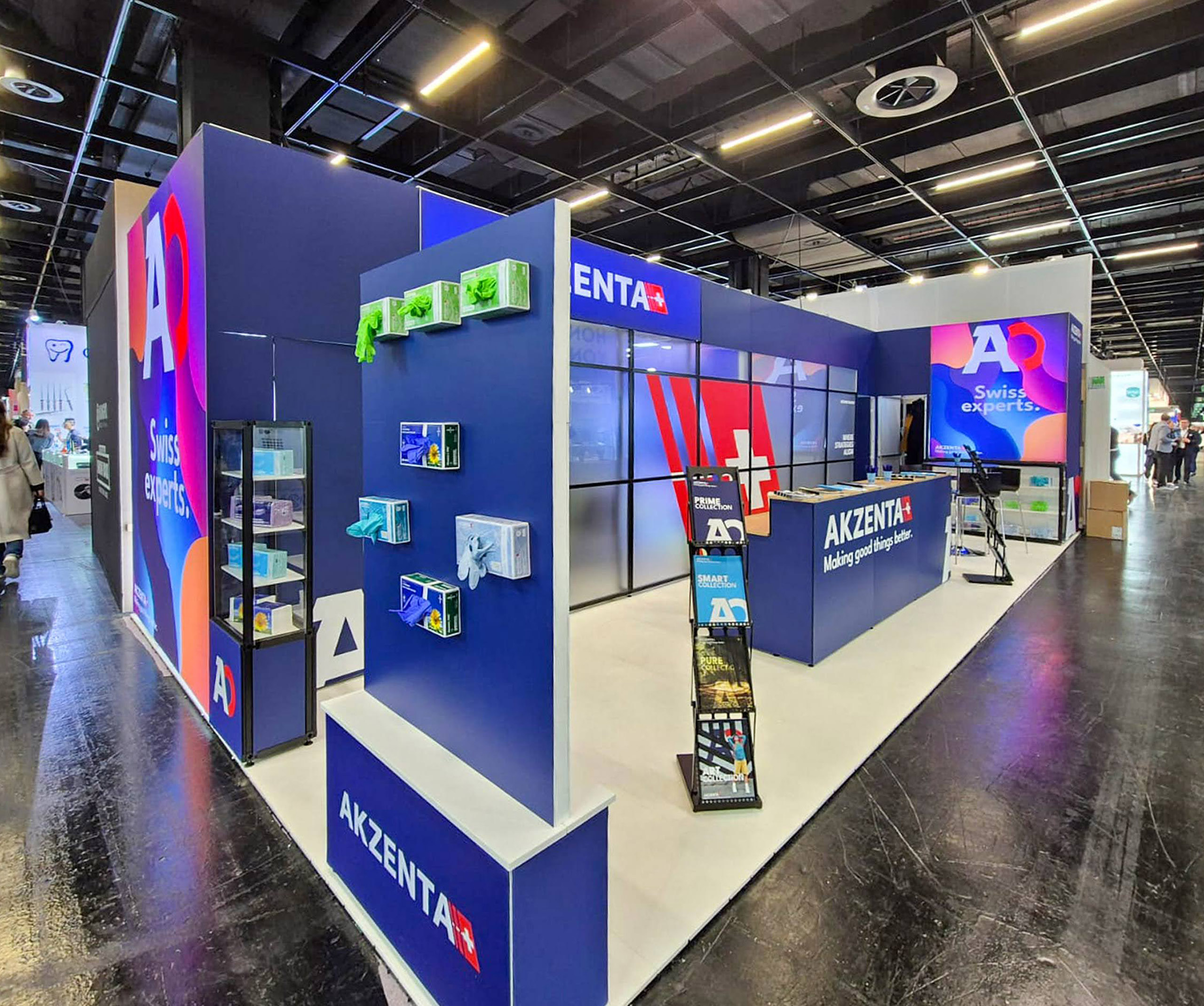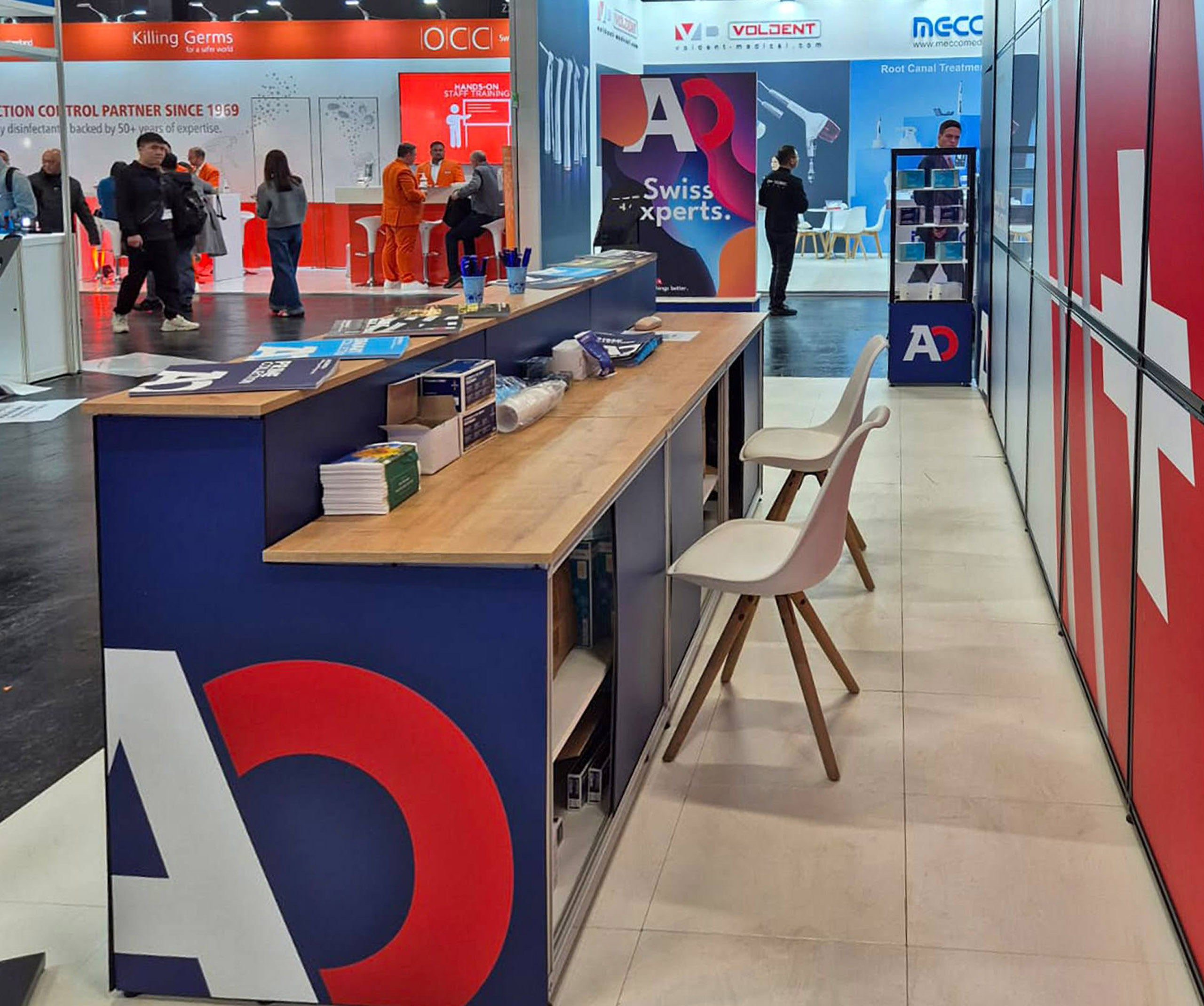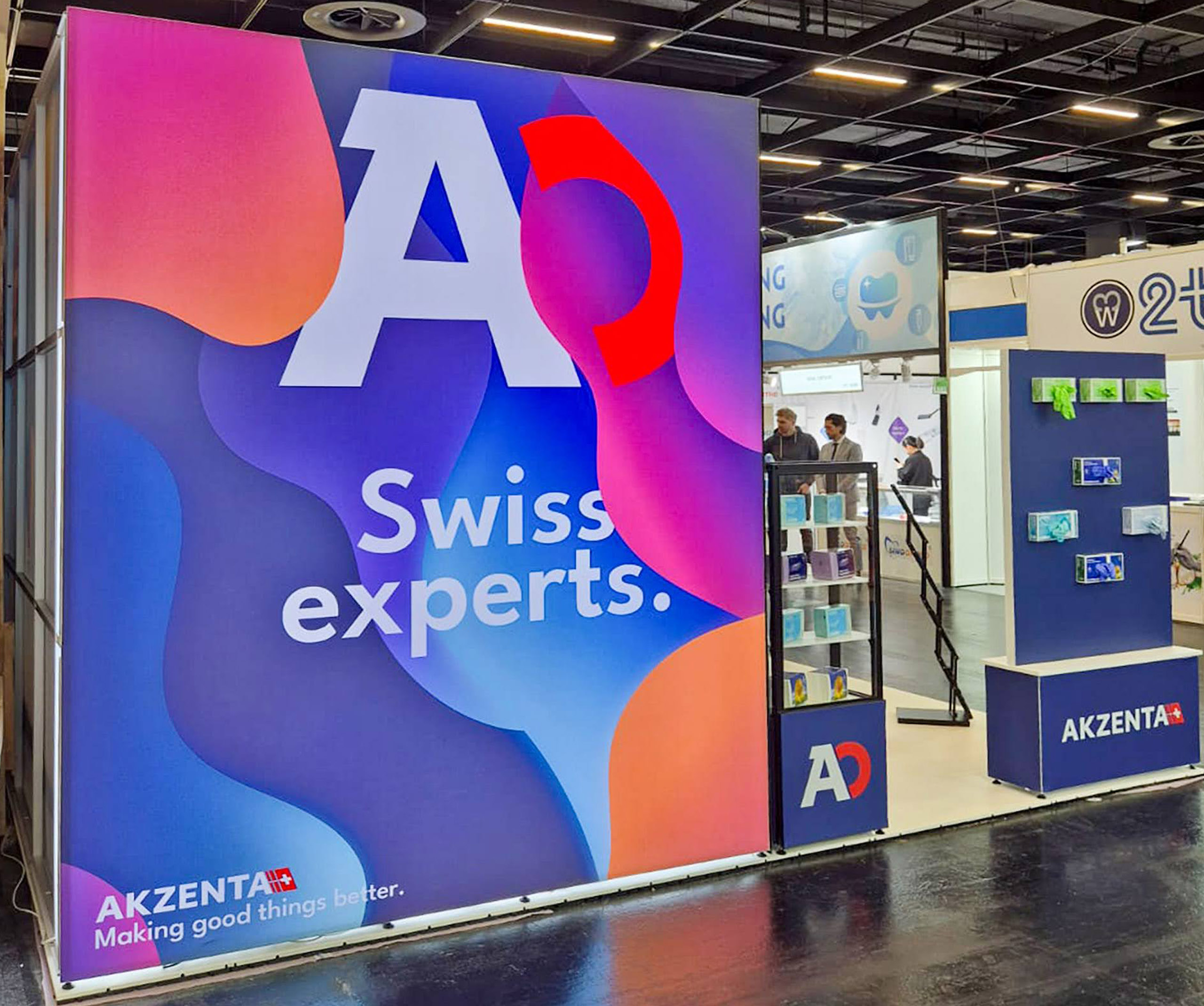 Biznisovo odlišne poňatý výstavný stánok pre klienta dodávajúceho spotrebný materiál pre dentálne ambulancie. Hlavnú časť stánku tvoria dve zasadacie miestnosti slúžiace na súkromné stretnutie s klientami. Vystavovaný produkt v tomto prípade ustúpil dôvernému rozhovoru s klientom a uzatváraniu dohôd. Zasadacie miestnosti sú predelené efektným Lightboxom. Praktické vitríny boli navrhnuté na mieru a sú súčasťou tohto strohého, no účelného dizajnu.